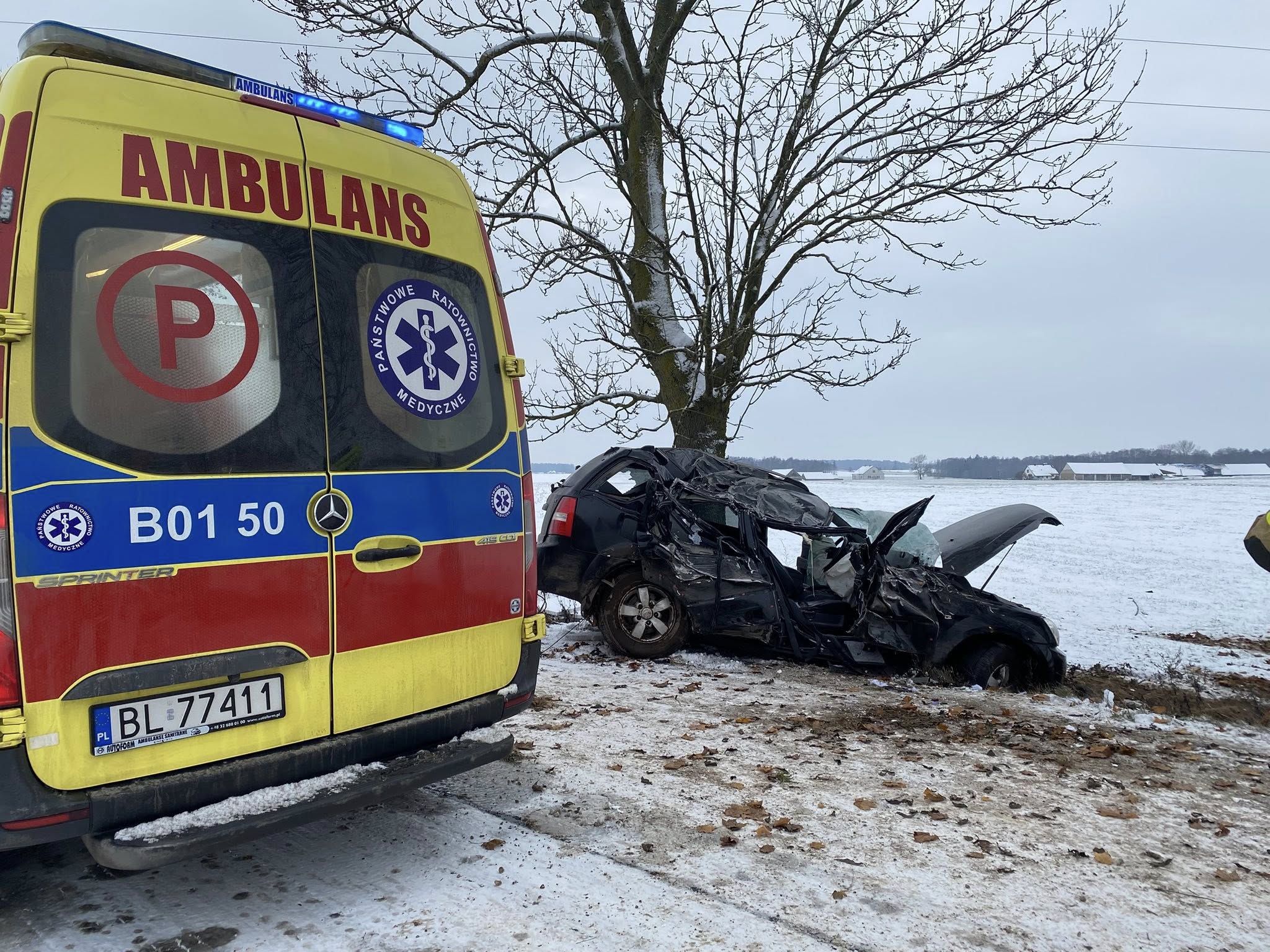 24 listopada 2025 r. W wypadku uczestniczyły dwie osoby, jedna osoba została przetransportowana śmigłowcem LPR do szpitala w Białymstoku. Zachowajmy szczególną ostrożność na drogach! fot. OSP Ławsk