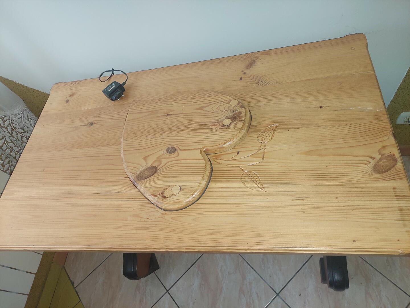 Blat stołu z drewna sosnowego ozdobne nogi zaś z drewna afrykańskiego w blacie jest podświetlenie w kształcie liścia w to miejsce również można włożyć taki sam liść z drewna więc będzie ozdobna podstawka