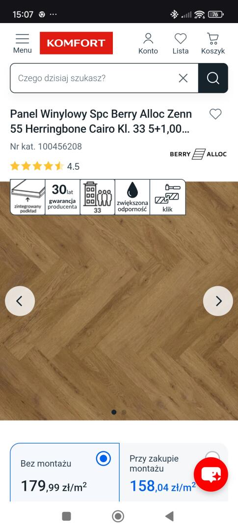 Odsprzedam 4 paczki paneli winylowych spc berry alloc zenn 55 herringbone cairo kl. 33 5+1,00 mm click z podkładem. Kupione w sklepie Komfort. Można obejrzeć w Grajewie mam jeszcze kilka paneli w otwartej paczce. Ok. 7.88 m2. Cena za 4 paczki.