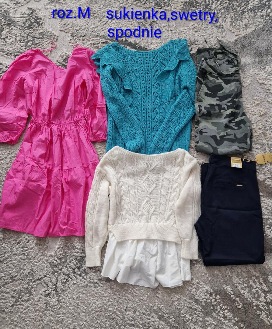 Sprzedam ubrania roz.M sukienka,2szt spodni nowych ,2 swetry.Stan bardzo dobry.